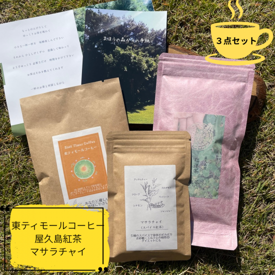 | 商品詳細 | 東ティモールコーヒー [OLAM社とアジア開発銀行、JICAと共にプロジェクトを立ち上げ、フェアトレードを取得したオーガニックコーヒー] 屋久島紅茶[自然豊かな環境の中で大切に育てられた国産オーガニック和紅茶] マサラチャイ[体が温まるスパイスをブレンドした紅茶。スパイスティーとしてお飲みいただけます。] 全て大切に栽培されたオーガニックです。 |